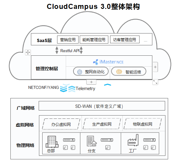華為云園區網絡解決方案3.0 (CloudCampus 3.0) , 應用IoT、Wi-Fi 6、 SDN、 SD-WAN、云管理和AI等 技術,幫助企業構建一張全無線接入,全球一張網,全云化管理和全智能運維的園區網絡。從而,企業將受益于 極速的無線業務體驗,隨時隨地的自由協作和溝通,敏捷的云應用上線,以及可靠的應用體驗保障,讓大企業、政府、高校、普教、 醫療、零售、交通等各行業, 在云時代抓住數字化轉型新機會。